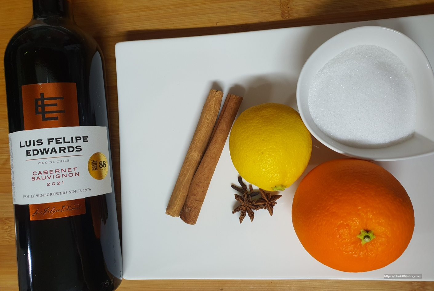 레드와인 1병, 오렌지 1개, 레몬 1개, 시나몬스틱 2~3개, 팔각정 2~3개, 정향 3알, 설탕 70g(다른 과일, 천혜향, 사과 등), 굵은소금 1스푼, 베이킹소다 1큰술