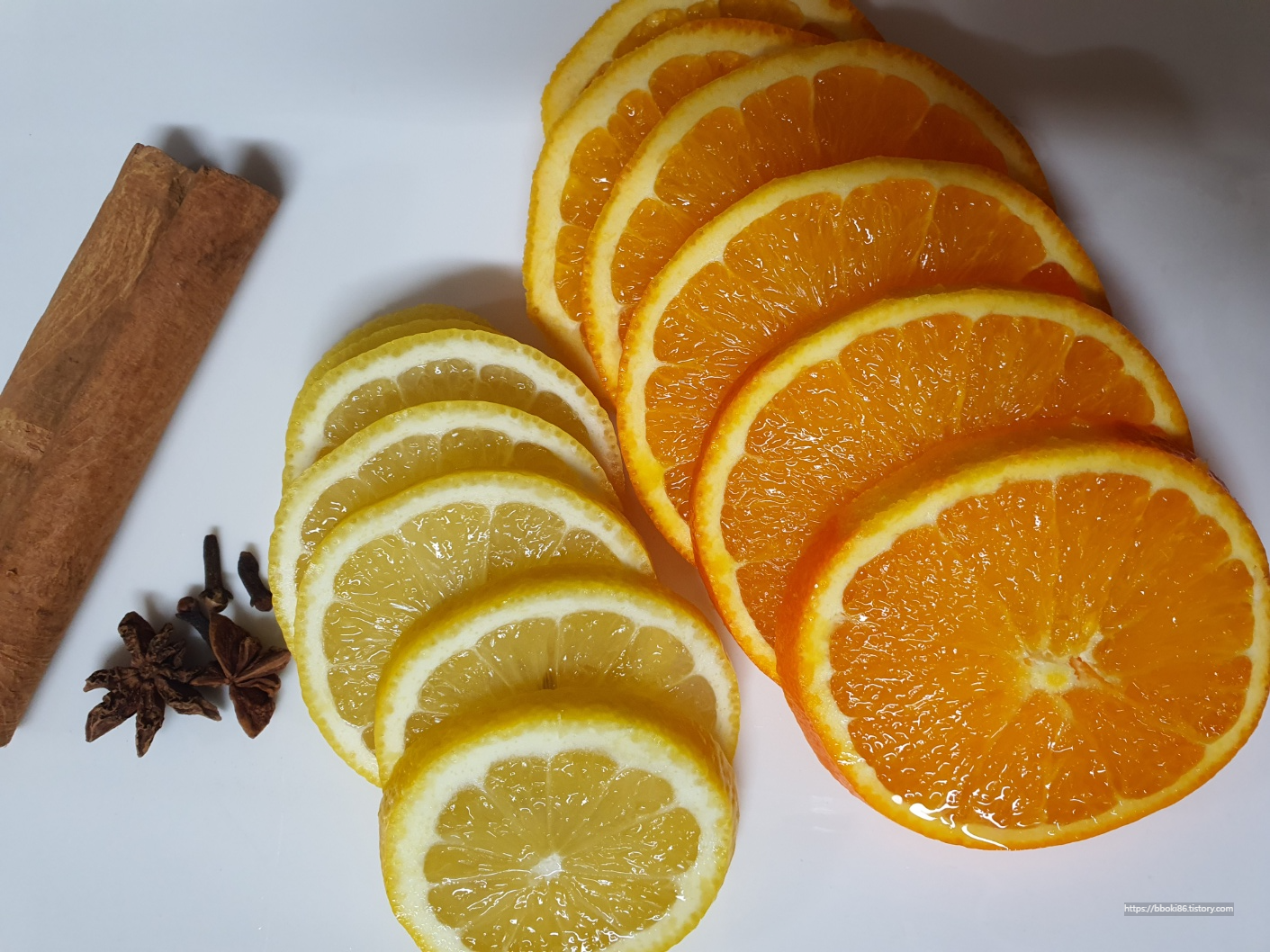 세척하고 소독한 오렌지와 레몬을 슬라이스합니다.