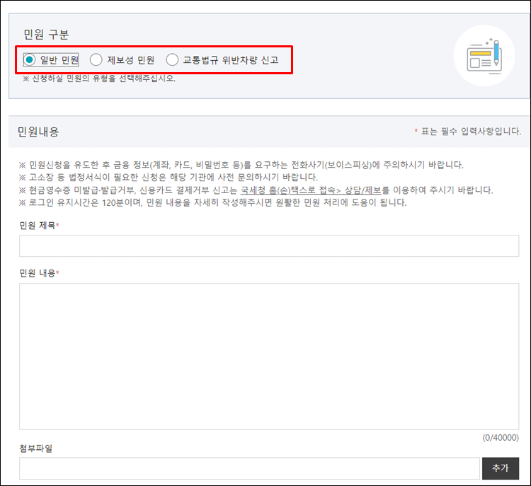 로그인을 하셨다면 민원을 분류하여 신청하셔야 합니다.