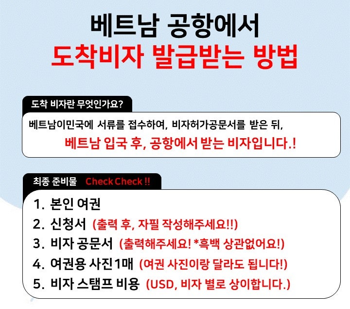 베트남 출국 시 필요한 서류* 도착비자!! USD 25 별도 지불 조건1 현지공항 도착시. 2 신분증 사진2. 출력된 허가증 1부(차공선 출발 전 카톡으로 전송) 3. 자필 베트남비자신청서 (출발전 카카오톡으로 서류발송은 공센 확인) 문의 1533-1828