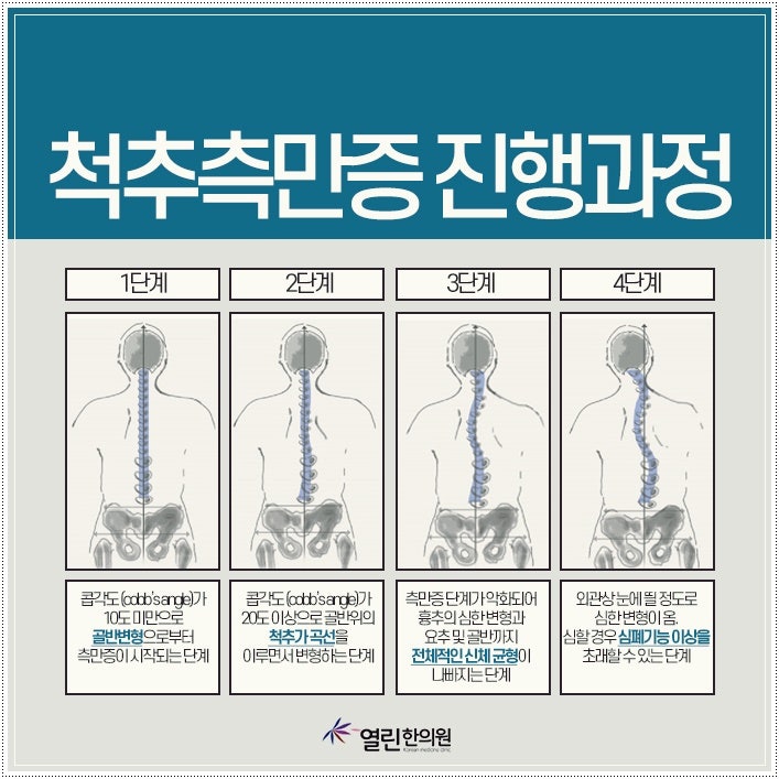 성장기 어린이와 청소년은 자라면서 척추 측만증이 발생할 수 있으며 합병증이 발생할 수 있으므로 주의 깊게 관찰해야 합니다. 성인기에 발견된 척추측만증은 치료가 어려우므로 조기 발견이 중요합니다.