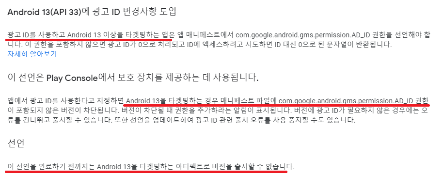 따라서 Android 13(sdk 32)을 대상으로 하는 앱에 대해서는 광고 ID 권한을 선언해야 합니다.