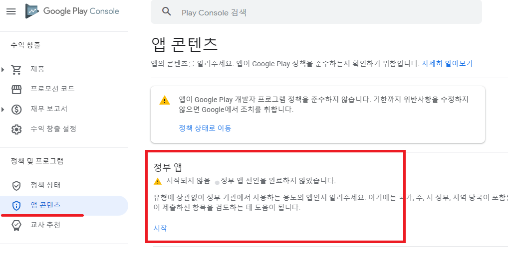 1. Google Play Console에서 “정책 및 프로그램 -> 앱 콘텐츠 -> 정부 앱 -> 홈”을 클릭합니다.