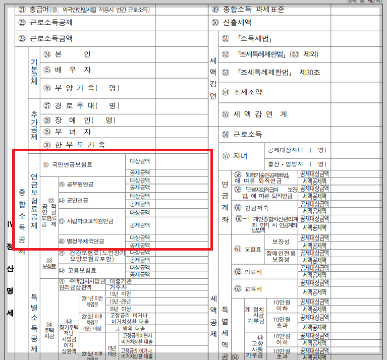 저희 회사에는 6월에 입사한 직원이 있었는데, 같은 해 1월부터 6월까지 지역가입자로 국민연금을 납부하였습니다. 이 경우 지역주민으로서 지급한 금액도 소득에서 공제됩니다. 이는 국민연금뿐만 아니라 공무원연금, 군인연금, 사립학교교직원연금, 특별우체국연금 등 5대 공적연금에도 적용된다. 특별소득공제