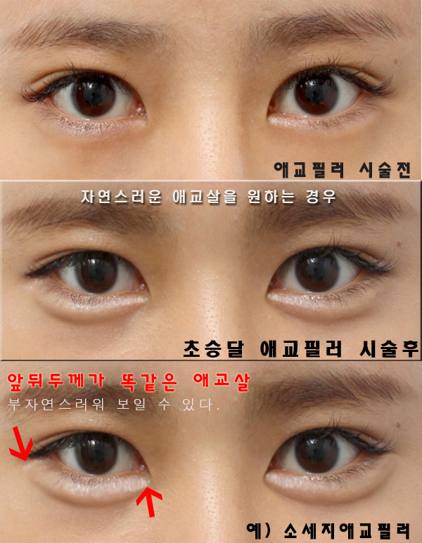 과도한 애교 필러에 대해 이야기할 때 빼놓을 수 없는 표현, ‘애벌레’입니다..눈 밑에 마치 애벌레가 기어가는 것 같은 두꺼운 애교가 대표적인 오버케이스입니다..애교가 너무 두꺼워서 인위적인 느낌과 외형이 조금 부담스럽죠?