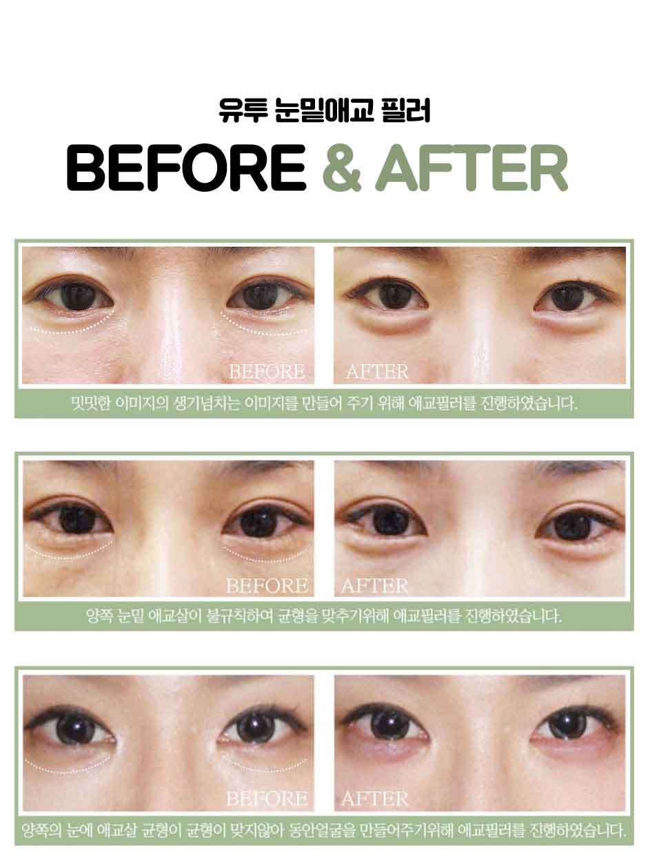 과도한 애교 필러 제거 사례(앞뒤).눈 밑 애교의 경우 다른 부위에 비해 너무 튀기 때문에 필러가 녹을 때까지 기다리시는 분들은 거의 없어서… 거의 제거 시술을 찾고 있습니다..(눈물) (그래도 위 환자분들은 히알루론산 필러로 시술받아서 필러 녹이는 주사로 간단하게 녹였는데.. 그렇지 않은 경우도 있습니다.)