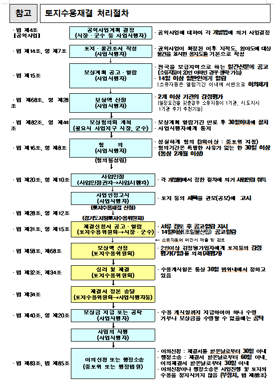 토지매수위원회는 공고 및 재심의결정을 받은 후 신청서 및 관계서류 사본을 토지가 있는 시·군·구(자치구 포함)에 송부하고, 토지매입위원회 게시판에 게시한다. 나. 시/군/구, 그리고 대중이 적어도 14 일 동안 읽을 수 있도록 합니다. 이 때 토지소유자 및 관계인에게 공고내용과 의견을 개진할 수 있다는 사실을 알려야 한다. 시·군·구청장은 공시기간 동안 공시결과 및 소유자가 제출한 의견을 토지취득위원회에 보고한다. 토지소유자 의견 제출 토지소유자 및 관계인원은 조사기간 중에 해당 시현토지취득위원회에 의견서를 제출할 수 있다. 의견서에는 특별한 형식과 내용이 없으며, 제출된 의견서는 토지취득위원회의 심의에 영향을 미치므로 단순 증감보상 외에 주요사항이나 의견서에서 쟁점이 될 수 있는 사항을 제출하여야 한다. 채택된 의견 제출은 토지 소유자 및 기타 사람들이 수용 결정에 참여하는 매우 중요한 수단입니다. 토지 소유자의 입장에서 서면으로 의견을 구하려고 노력해야 합니다. 토지수용위원회는 토지수용당사자간 보상분쟁을 제외한 사업시행자로부터 검토가 필요한 사항과 사업시행자가 협의가 필요하다고 판단하는 사항을 취합한다. 지주 등의 의견을 구하고 필요시 직접 현장조사를 실시한다. 가맹본부가 의견을 제출하고 토지수용위원회가 사업시행자에게 소유자의 의견에 대한 의견을 제시할 것을 요청하는 경우에는 소유자의 주장 내용에 대한 구체적인 이유를 제시하고 수용 여부를 명확히 표시하여야 한다. 증거제출 등 라. 미납신청 및 등기 등기신청 후 토지주와 협의하여 성립하거나 기타 사유로 토지등이 제외된 경우 2~3주 전 재결정, 사업시행자가 공문으로 상환 이외의 토지취득위원회에 요구사항을 제출하기 위한 서식 재결정 이외의 요청은 재결정 평가 이전에 하는 것이 가장 좋습니다. 한편, 상속 등으로 인한 소유자 변경 등 신청 판결 후 변경이 있는 경우에는 변경 신청을 위한 증빙자료를 첨부해야 합니다. 판결 감정 판결 감정은 보상 금액이 Land Court에서 선정한 두 명의 감정인이 평가한 가치의 산술 평균으로 결정되는 재감정입니다. 이번 판결은 수용절차를 완료하기 위한 행정처분으로, 사업시행자가 판결에서 정한 수용기간에 대한 보상금을 지급하기 전에 우선적으로 토지사용권을 취득하는 것은 형식적 행정행위이다. 신중, 비밀유지, 직권의 원칙에 따라 이해관계자는 심의에 참여하여 의견을 표명할 수 없습니다. 또한 무불만, 유감의 원칙에 따라 청구되지 않은 사항에 대해서는 협의가 불가능합니다(보상액 증액 결정 가능). 의결서는 의결의 순서·이유·일시 등을 기재하고 위원장 및 회의에 참석한 위원이 서명 날인한다. 결정서는 교부되고 교부된 때에 효력이 발생하므로 시정결정시(토지보상법 제36조) 유사과실이 있는 경우에는 사업시행자, 토지소유자 및 관계인에게 교부됨 배달 증명서와 함께 담당자, 판결 수정 요청. 정정판결은 원판결의 일부를 파기(정정)하는 새로운 판례의 효력이 있고, 개정판결은 소급하여 원판결의 효력을 가집니다. 새로 취득한 토지 및 기타 부분에 대한 판결이 누락된 경우 누락된 부분은 해당 토지 법원에서 별도로 계속하여 결정합니다. 결정의 효력(토지보상법 제42조) 수용 또는 사용 개시일까지 관할 토지수용위원회에서 결정한 보상금을 지급 또는 공탁하지 아니한 경우 해당 수용결정은 무효가 된다. 이 경우 사업시행자는 재결의 무효로 인하여 토지소유자 또는 관계인이 입은 손실을 배상하여야 한다.