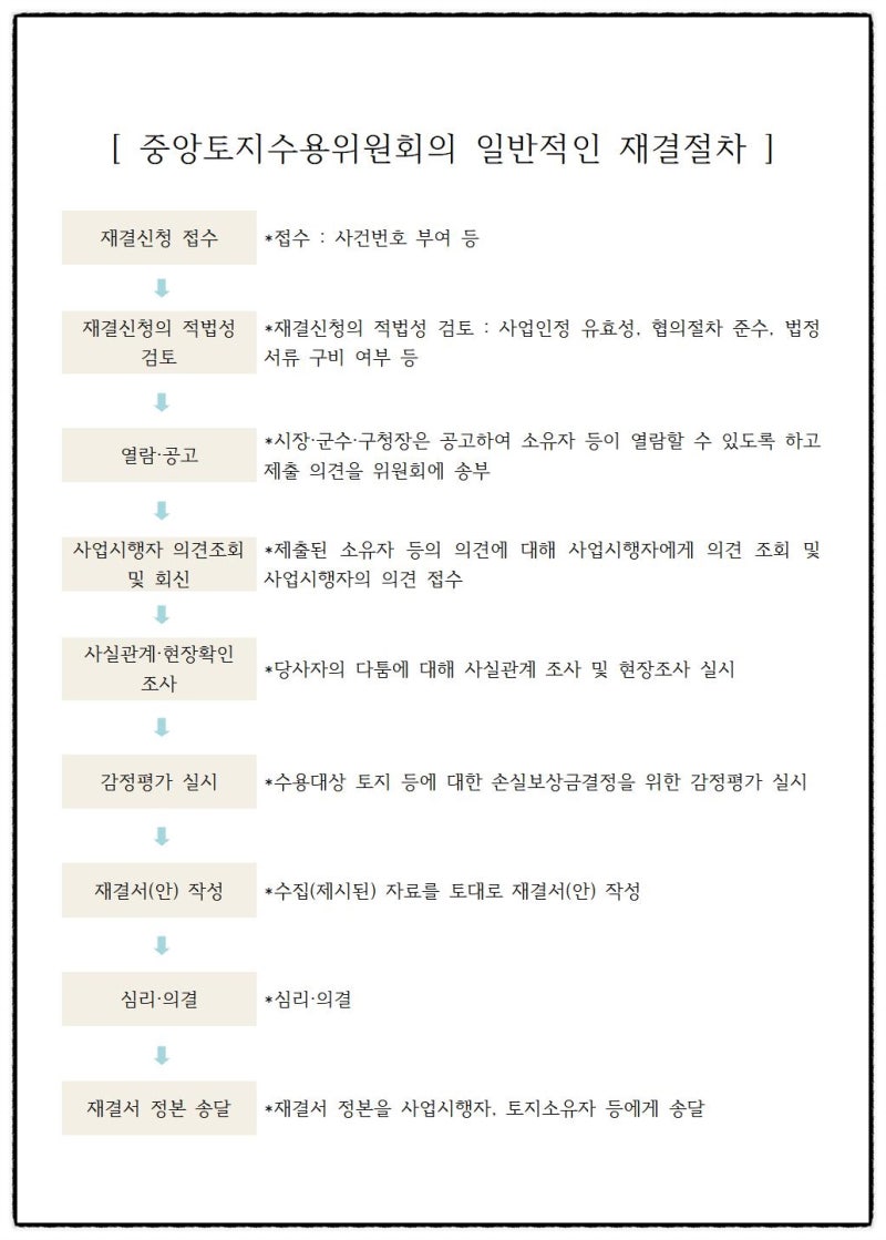 토지보상법에 따른 토지수용위원회는 국토교통부가 설치하는 중앙토지수용위원회와 시·도가 설치하는 지방토지수용위원회로 구분된다. 토지법원은 사업시행자로부터 재정신청서를 접수한 후 통상 4~5개월의 재정절차를 거친다. 토지취득위원회의 결정까지 이르는 과정을 단계별로 살펴보겠습니다.