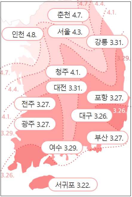 2022년에 비해 남부지방은 지난해보다 0~2일, 중부지방은 지난해보다 0~6일 일찍 벚꽃 개화를 시작할 것으로 보인다. 3월의 기온 변화의 영향이 크기 때문에, 조금 더 일찍 꽃이 필요한 것 같습니다.
