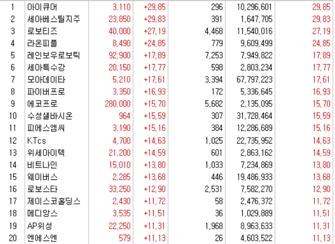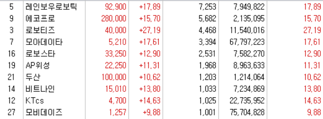 | 10 | 모비 데이즈 | Facebook의 공식 AI 파트너인 Mobidays의 주가는 Meta가 대규모 언어 모델(LLM)을 발표하면서 상승했습니다.