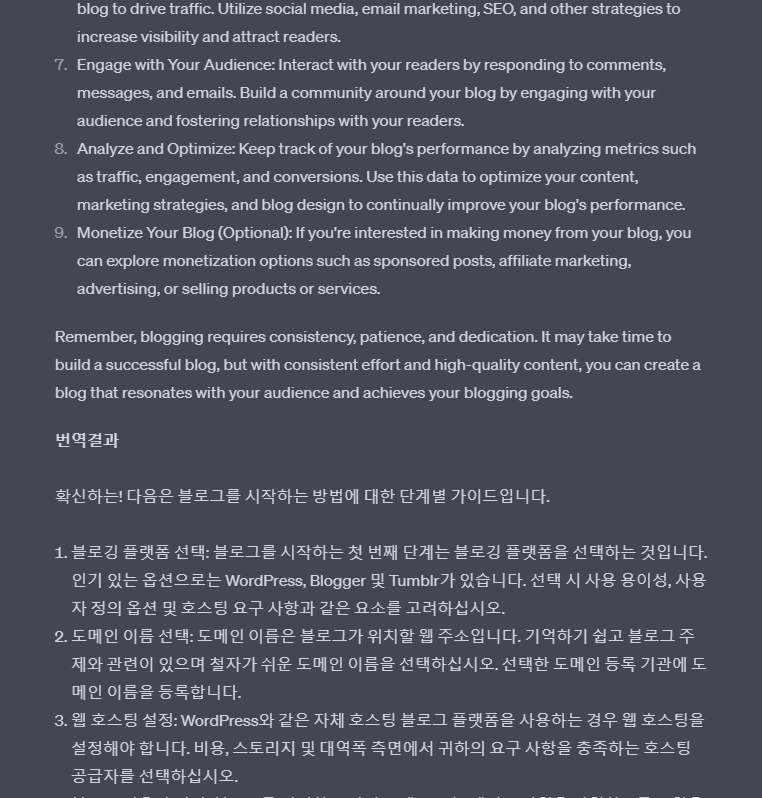 현재 사용하는 방법은 파파고에서 한글로 작성 후 번역된 영문을 GTP에 입력하여 사용하는 방식입니다.
